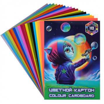 Картон цветной Лилия холдинг "Космический неоновый котик", А4, 18 л., 18 цв., мелованный, односторонний, в папке, НК-9094
