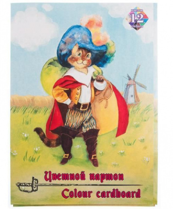 Картон цветной ГОЗНАК "Кот в сапогах", А4, 12 л., 12 цв., односторонний, мелованный в папке, 200 г/м2, ЦК-3619